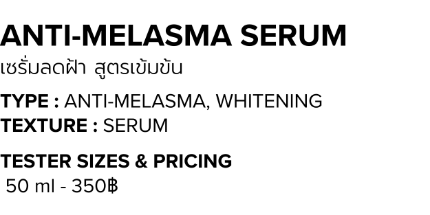 เซรั่มลดเลือนฝ้า ที่ช่วยให้ฝ้าจางลงอย่างเป็นธรรมชาติ ช่วยลดเลือนฝ้า กระ จุดด่างดำ ลดการสร้างเม็ดสีผิวที่มากผิดปกติ ซึ่งเป็นสาเหตุของการเกิดฝ้า ให้ผิวกระจ่างใสขึ้น พร้อมบำรุงผิวให้ชุ่มชื่น