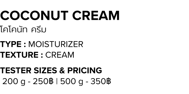 ครีมบำรุงผิวกายเพื่อให้ความชุ่มชื้น ส่วมผสมหลักจากน้ำมันมะพร้าว ช่วยบำรุงผิวให้เนียนนุ่ม ชุ่มชื่น ดูน่าสัมผัส ฟื้นฟูผิวให้แข็งแรง และยังช่วยลดเลือนริ้วรอยก่อนวัยอันควร เนื้อครีมซึมเข้าผิวง่าย ไม่เหนียวเหนอะหนะ บางเบา