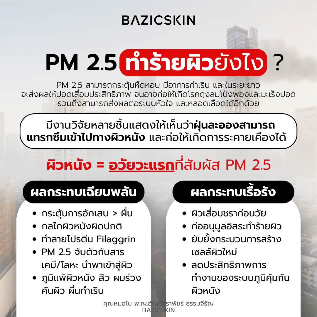 PM 2.5 จะทำลายโปรตีนที่ผิวหนัง (Filaggrin) ซึ่งมีหน้าที่เป็นโปรตีนที่ช่วยป้องกันผิวหนัง และเพิ่มการหลั่งสารกระตุ้นการอักเสบที่ผิวหนัง ดังนั้นเมื่อผิวหนังสัมผัสกับฝุ่นละออง PM 2.5 ก็จะเกิดการอักเสบ ระคายเคืองที่ผิวหนังได้