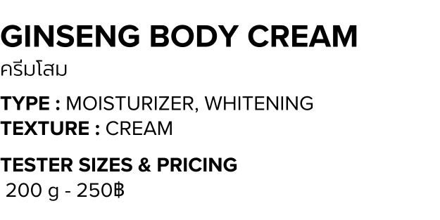 ครีมบำรุงผิวกาย ที่ประกอบไปด้วยสารสกัดจากโสม ช่วยเพิ่มความชุ่มชื้นและช่วยเพิ่มความหยืดหยุ่นให้กับผิว (Tonic and elasticizing) ช่วยลดริ้วรอย (Anti-Wrinkle) ช่วยปรับสภาพผิวพรรณให้เต่งตึง แลดูอ่อนกว่าวัย ช่วยทำให้ผิวอ่อนนุ่มและชุ่มชื้นมากขึ้น อีกทั้งยังมีสารสกัดจากเปลือกมะนาว, Kojic acid และ Niacinamide ช่วยดูแลฟื้นฟูผิวให้กระจ่างใส และแก้ปัญหา กระ ฝ้า จุดด่างดำ ทำให้ผิวขาว เนียนใส อย่างเป็นธรรมชาติ