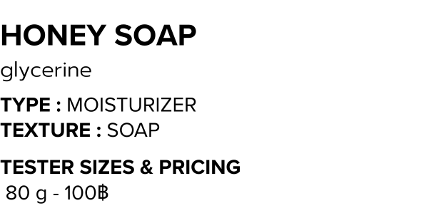 สบู่น้ำผึ้ง เปี่ยมด้วยเนื้อฟองนุ่มและความชุ่มชื่นจากกลีเซอรีน ผสานคุณค่าของน้ำผึ้งและน้ำมันมะพร้าว ช่วยคงความชุ่มชื้นให้กับผิว ไม่แห้งกร้าน ช่วยให้ผิวเนียนใส มีความกระชับ นุ่มชุ่มชื่นน่าสัมผัสอย่างเป็นธรรมชาติ
