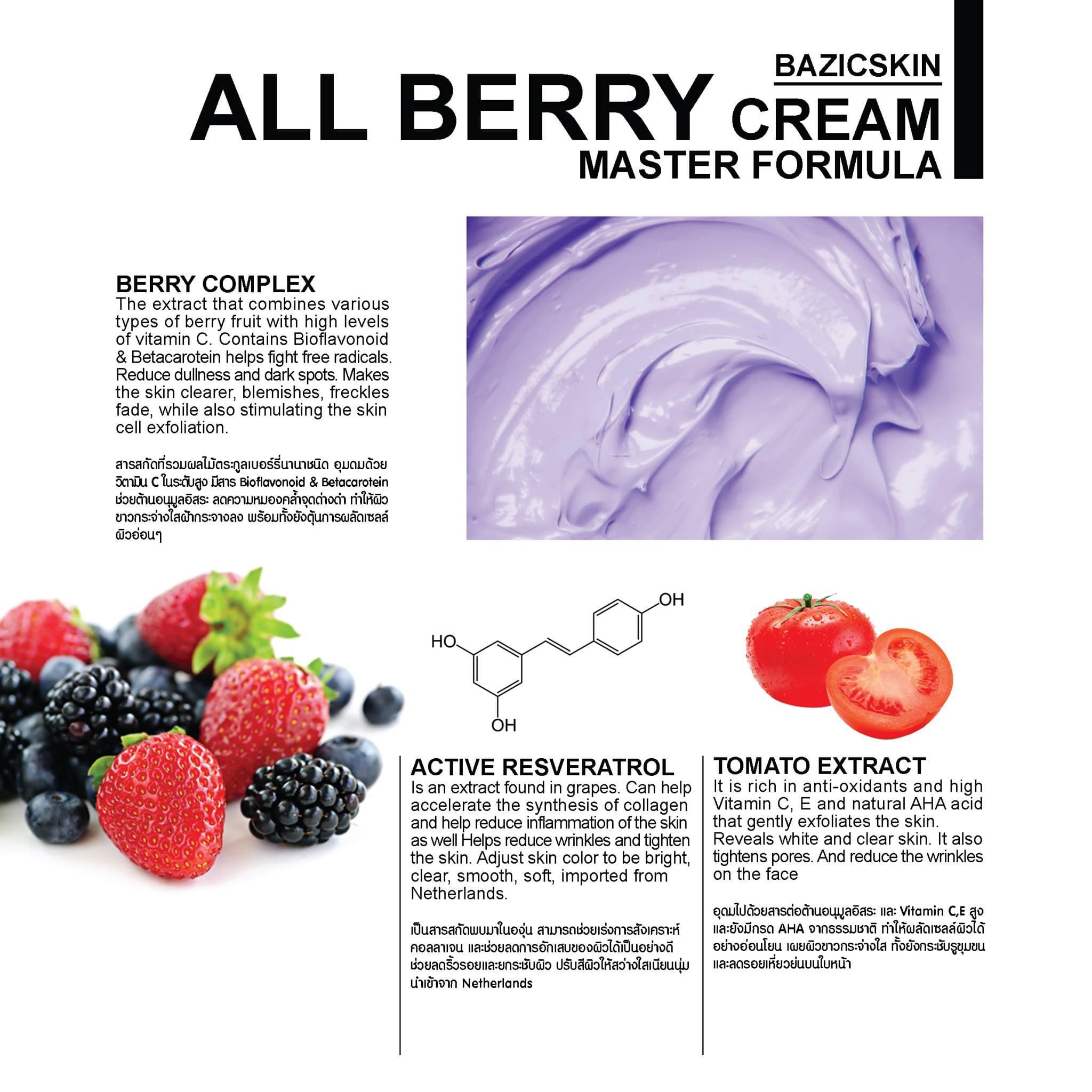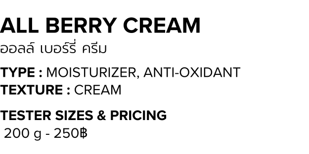 ครีมบำรุงผิวกาย ที่ประกอบไปด้วยสารสกัดที่รวมผลไม้ตระกลูเบอร์รี่นานาชนิด อุดมไปด้วย Vitamin C ในปริมาณสูง มีสาร Bioflavonoid, Betacarotein ช่วยต้านอนุมูลอิสระ ลดความหมองคล้ำ จุดด่างดำ ทำให้ผิวขาวกระจ่างใสขึ้น ฝ้า กระ จางลง พร้อมทั้งยังกระตุ้นการผลัดเซลล์ผิวอ่อนๆ