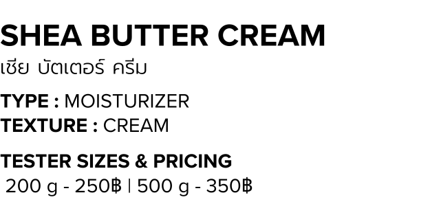ครีมบำรุงผิวกายเพื่อให้ความชุ่มชื้น ส่วมผสมหลักจากเชียร์บัตเตอร์ธรรมชาติ ผสานคุณค่าจากน้ำมันมะพร้าว และวิตามินอี ช่วยบำรุงผิวให้เนียนนุ่ม ชุ่มชื่น ดูน่าสัมผัส เนื้อครีมซึมเข้าผิวง่าย ไม่เหนียวเหนอะหนะ