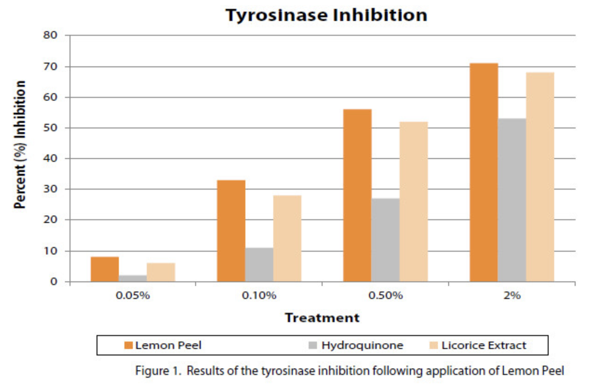 สารสกัดจากเปลือกมะนาว สกัดด้วยการนำเปลือกของผลมะนาวไปบ่ม (fermentation) ด้วยแบคทีเรียแลคโตบาซิลัส คล้ายกับการบ่มโยเกิร์ต ซึ่งจะได้ประสิทธิภาพการระงับกระบวนการสร้างเม็ดสีผิว (tyrosinase) ในระดับสูงถึง 70% ซึ่งมีความปลอดภัยและมีประสิทธิภาพสูงกว่า ไฮโดรควิโนน (Hydroquinone)